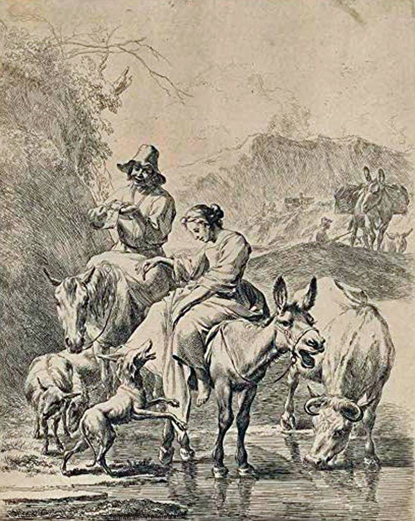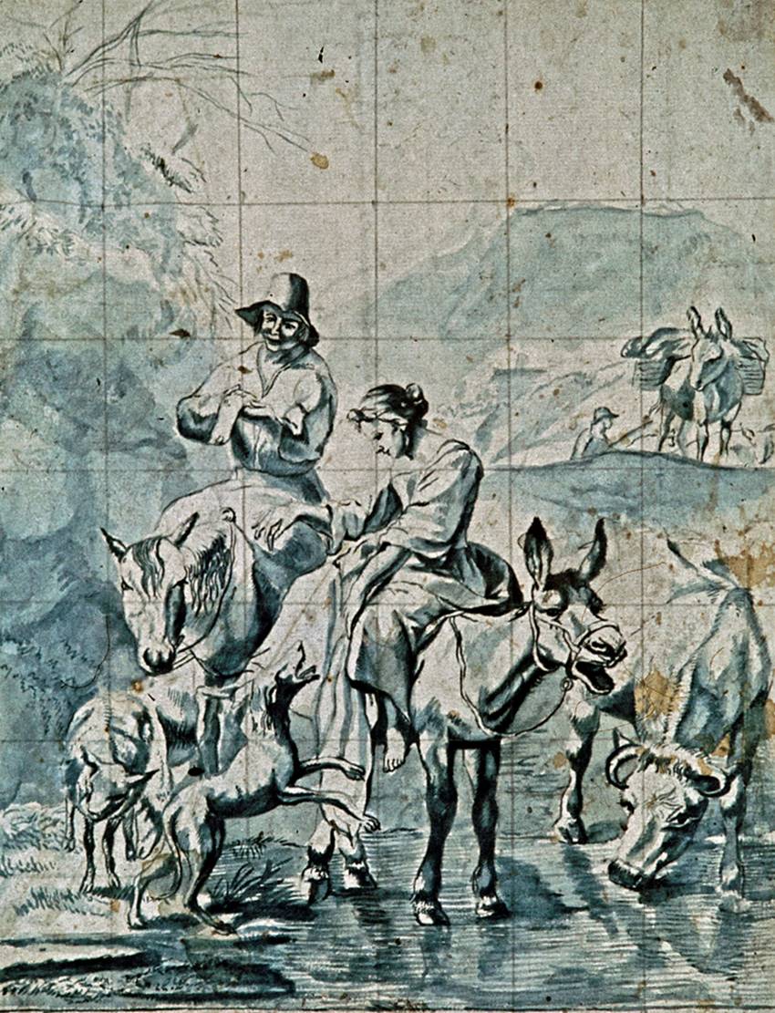 Das Fliesengemälde in der Krimpenerwaard ist eine spiegelbildliche und vereinfachte Darstellung nach dieser Radierung des Nicolaes Pietersz Berchem (* 1620 in Haarlem - + 1683 in Amsterdan). 1642 trat Berchem in die Haarlemer St. Lukasgilde ein. Nach 1648 studierten Jacob Ochtervelt und Pieter de Hooch bei ihm. Berchem zählt mit seinen Gemälden, Handzeichnungen und rund sechszig Radierungen zu den Hauptvertretern der niederländischen Landschaftsmalerei des 17. Jahrhunderts.