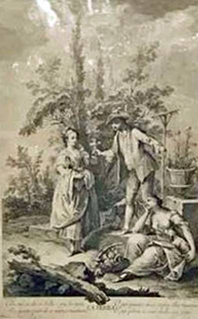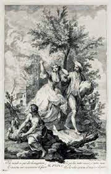 Reproduktionsstich des Augsburger Kupferstechers Johann Georg Hertel (1700 – 1775) in der Serie No. 86. Das Blatt trägt die folgenden Hinweise: Amiconi, inv. ... Joh. Georg Hertel, excud. Aug.V. und hochgestellt die Blattzahl 3.