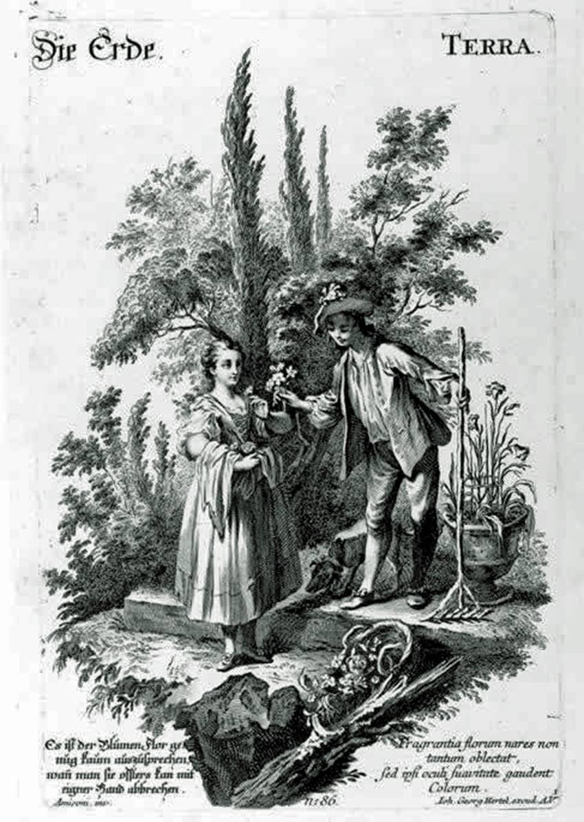 Vorlage für die Allegorie ‚Terra - Erde‘ war diese Druckgrafik nach Giacomo Amiconi. Zuerst erschienen diese Stiche der Vier Elemente bei Joseph Wagner (Thalendorf 1706 – 1780 Venedig), einem Schüler des Amiconi. Die vier Blätter tragen als Beischriften die Seriennummer 32, die Blattzahlen 1 bis 4 und Amiconi inv. ... Appo Wagner Ven.a C.P.E.S. Dem Impressum nach sind die Blätter nicht vor 1749 entstanden, da Wagner in diesem Jahr das Privileg erhielt.