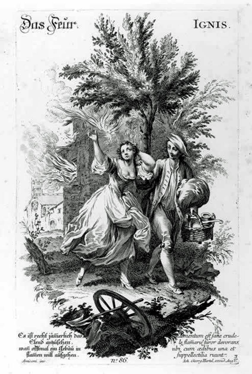 Sicher regten die Wagnerschen Reproduktionsstiche den Augsburger Kupferstecher Johann Georg Hertel (1700 – 1775) an, seinerseits in der zweiten Hälfte des 18. Jahrhunderts eine Folge der Vier Elemente herauszubringen. Dieses Blatt nach Amiconi ist eine Radierung des Augsburgers Joh. Georg Hertel in der Serie No. 86. Das Blatt trägt die folgenden Hinweise: Amiconi, inv. ... Joh. Georg Hertel, excud. Aug.V. und hochgestellt die Blattzahl 1.