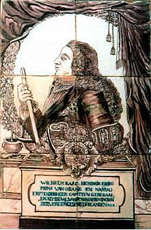18 Het portret met de prins is in 1766 opnieuw uitgegeven, waarbij binnen dezelfde contouren de prins nu als achttienjarige is voorgesteld.