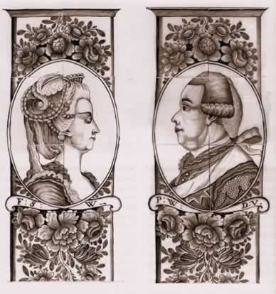 Na het huwelijk van prins Willem V met de Pruisische prinses Wilhelmina in 1767 zijn hun portretten in grote aantallen op borden, schotels, kaststellen, plaquettes en andere keramische voorwerpen geschilderd. De meeste weergaven zijn zeer schematisch, met de namen afgekort tot de beginletters en soms met een berijmde tekst. De grote politieke spanningen tussen patriotten en prinsgezinden vanaf de jaren 1770 verklaren de toenemende behoefte aan portretten van de stadhouder. De kwaliteit van de voorstellingen is in de regel matig. Op tegels vinden we het echtpaar verwerkt in pilasters en op ruitertableaus. Opvallend is dat prinses Wilhelmina altijd aan de linkerzijde was geplaatst. De machtspositie van de Oranjes was vaak sterker dan hun formele positie, en een huwelijk op niveau voor de Oranjes was officieel gezien vrijwel altijd een huwelijk boven hun stand.