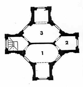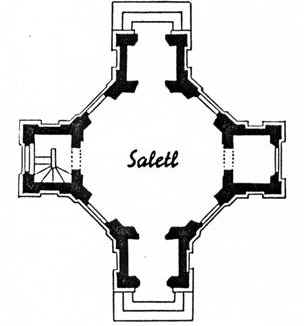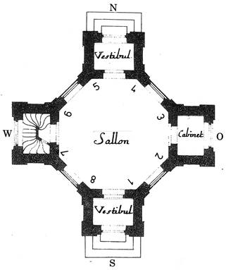 Dem regelmäßigen Oktogon des ‚Sallon/Saletl’ schließen sich in die vier Himmelsrichtungen weisende querrechteckige Kreuzarme an. Die angefügten Kreuzarme enthalten im Norden und Süden je ein Vestibül, die durch rundbogige Öffnungen mit dem ‚Sallon/Saletl’ verbunden sind. Im nach Westen gelegenen Raum ist eine wendeltreppenartige Holzstiege zum Obergeschoss eingearbeitet. Der östliche Kreuzarm wurde als Kabinett ausgebaut und vom Zentralraum durch eine zweiflügelige Tür getrennt.