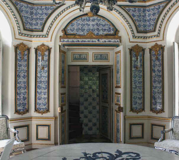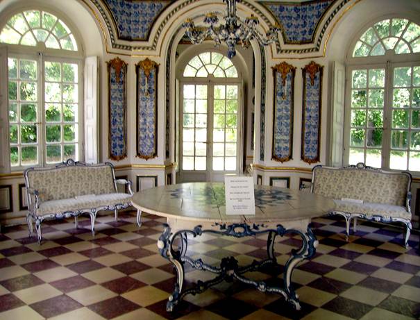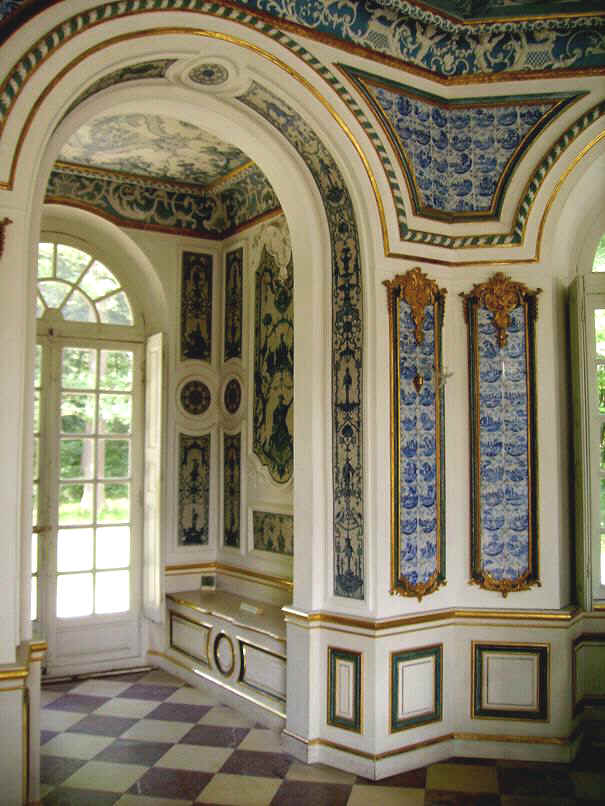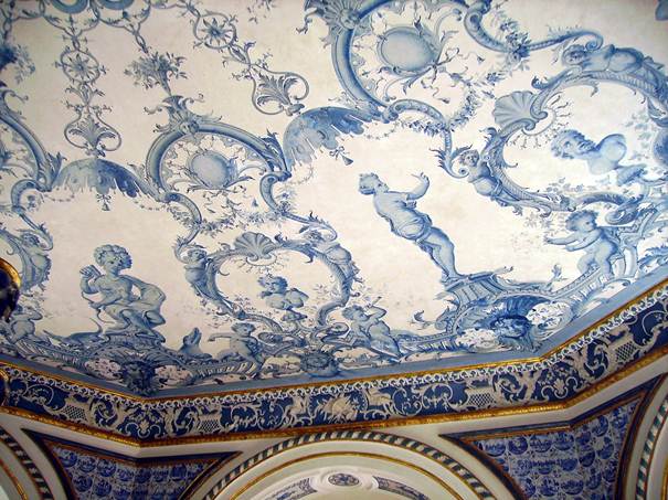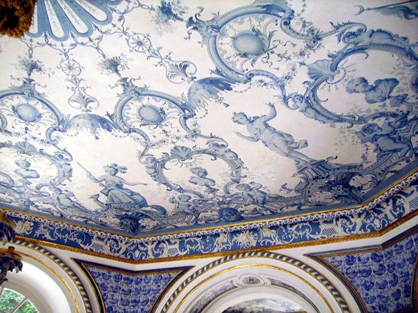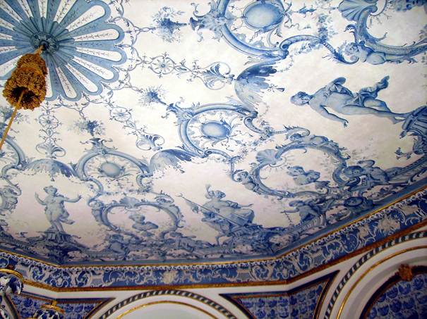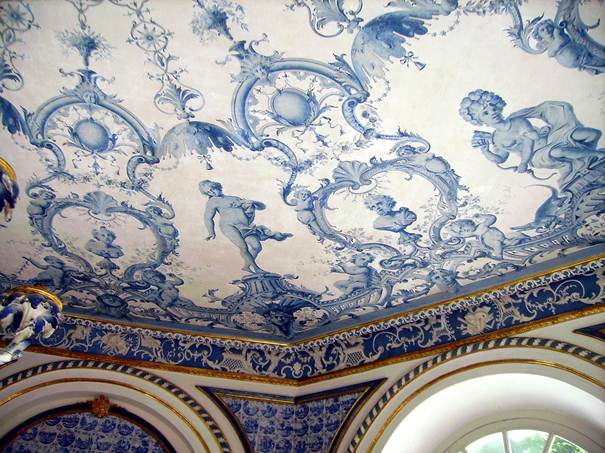 Amsterdamer Fliesen in blauer Bemalung auf weißem Grund in den Zwickelfeldern und Trumeaus 5 und 4 vermitteln Kühle und sind Ersatz für ostasiatisches Porzellan. An der Decke hängt ein achtarmiger geschnitzter Kronleuchter in Nachahmung von Porzellan weiß und blau gefasst. Weiß und Blau sind auch die Farben des Geschlechts der Wittelsbacher.