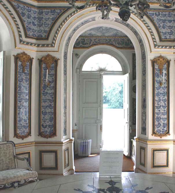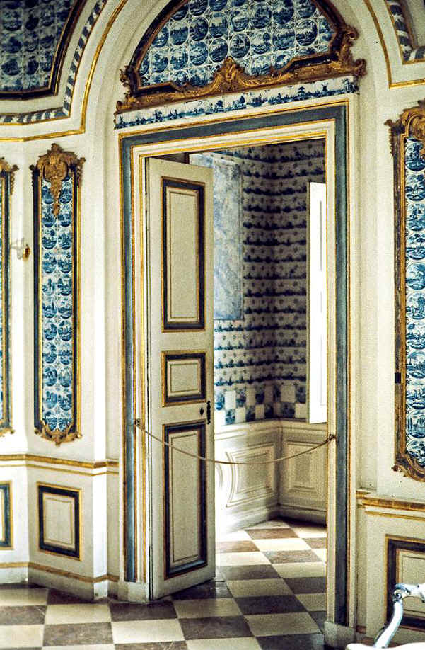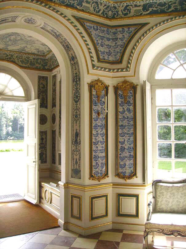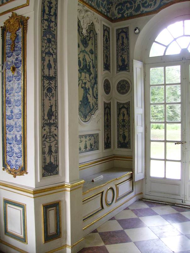 Ob das Band aus Fliesen der Art ’Landschap op land’ mit dem Eckmotiv ’spin’ über der Tür zur Erstausstattung gehört oder ob es bei einer ersten grundlegenden Instandsetzung der Pagodenburg in der Regierungszeit Max III. Josephs unter Leitung François Cuvilliés d.Ä. um 1767 eingearbeitet wurde konnte ich nicht klären.