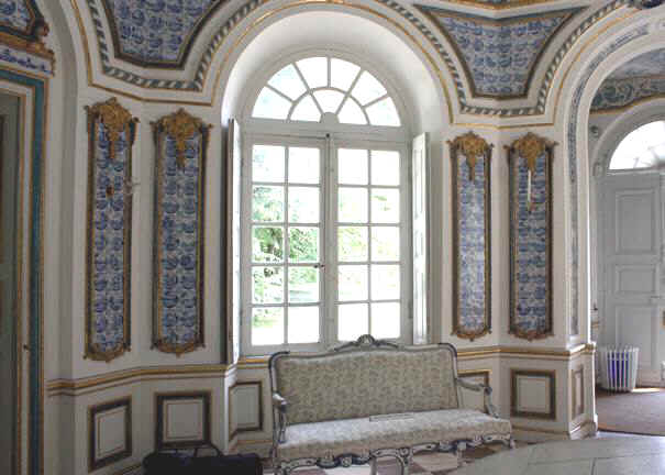 In den acht Innenecken des ‚Sallon/Saletl’ sind jeweils zwei Zwickelfelder mit vierundzwanzig Fliesen gefüllt. Diese insgesamt dreihundertvierundachtzig Fliesen in blauer Bemalung sind sehr sorgfältig ausgeführt. Obwohl mir bis jetzt keine Belege für Fliesenlieferungen zur Pagodenburg bekannt sind, möchte ich die Fliesen Amsterdamer Fayencewerkstätten zuschreiben.