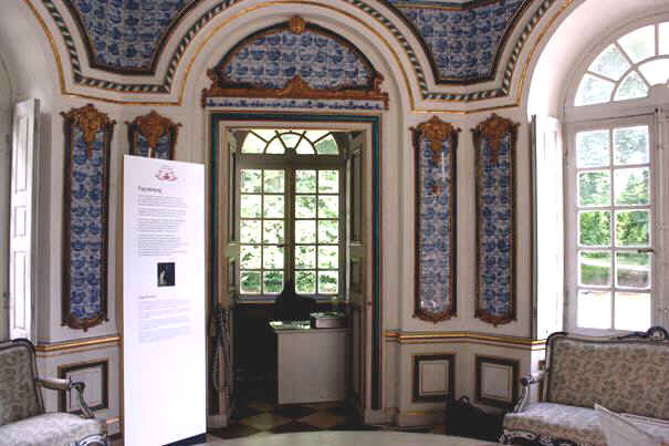 „.... In das Ober-Apartement, steigt man über eine Stiege, deren Staffeln von polirtem Nußbaumholz, die Lehne aber zum Anhalten sehr schön und von vergüldetem Eisen. Die Wände sind mit grossen Stücken von Chinesischem Porcellan bedeckt, welche allerhand Austheilungen machen, und durch ihre Zusammenfügungen auch grosse Landschafften präsentiren...“