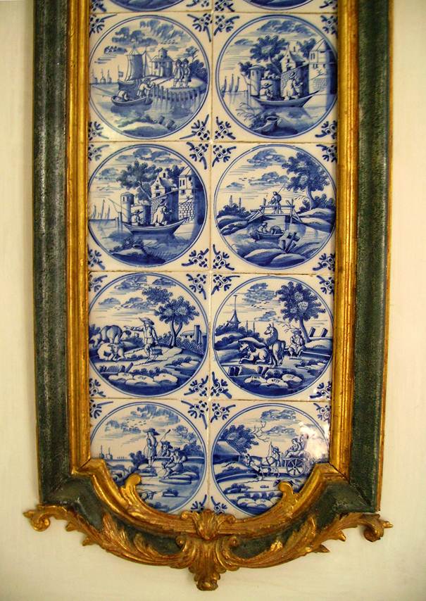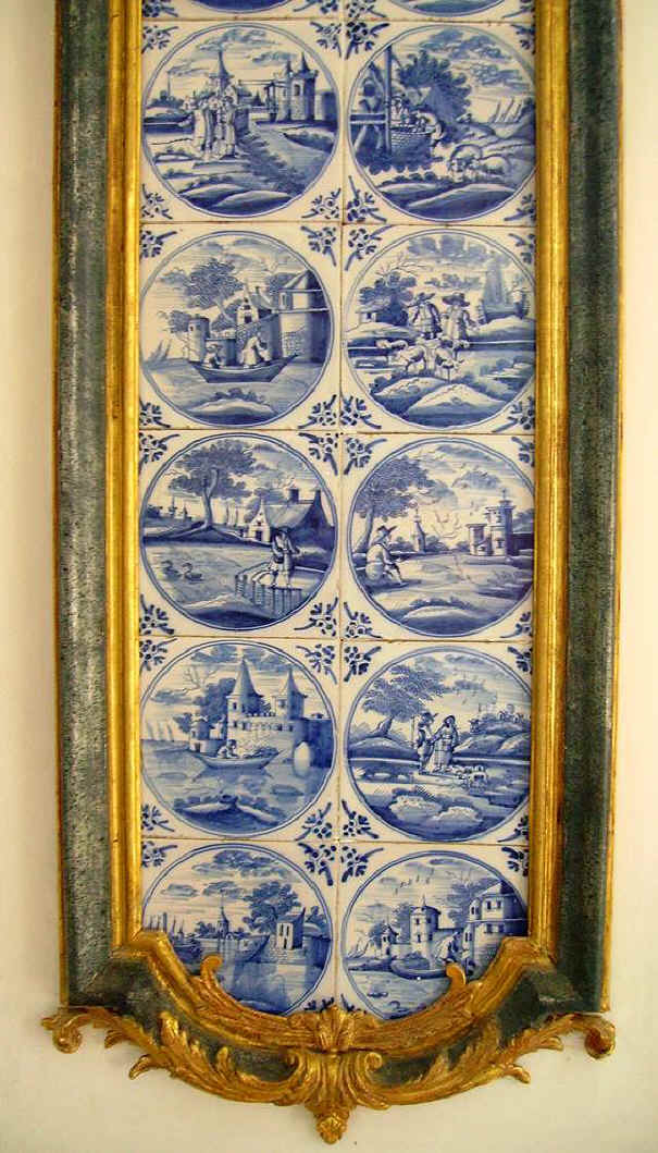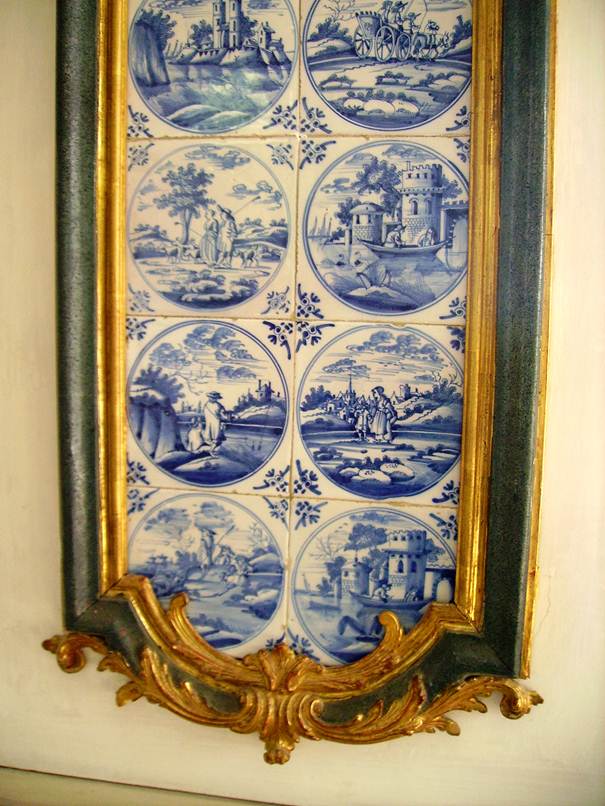 Die Fliesen der Supraporte, der Zwickelfelder und Trumeaus 3 und 2 zeigen vielfältigste Landschaften und figürliche Szenen im doppelten Kreis mit dem Eckmotiv ’ossenkop’.