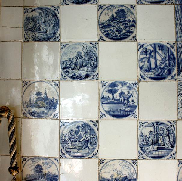 Die Wandbekleidungen reichen von den Holzstufen bis zur Stuckdecke. Rotterdamer Landschafts- und Bibelfliesen wurden im Wechsel mit uni weißen Fliesen angesetzt. Die blauen Landschaften und biblischen Motive im doppelten Kreis mit dem Eckmotiv ’ossekop’ haben eine dichtere und weichere Bemalung als die Fliesen im ’Sallon/Saletl’. Die Art der Bemalung lässt die einzelnen Fliesen stärker blau erscheinen und so im Gegensatz zu den benachbarten weißen Fliesen noch stärker in Erscheinung treten.