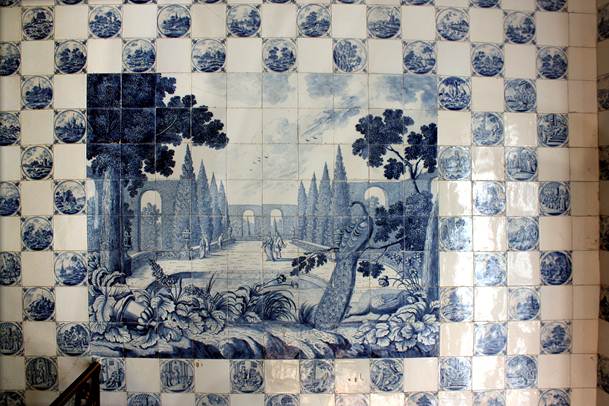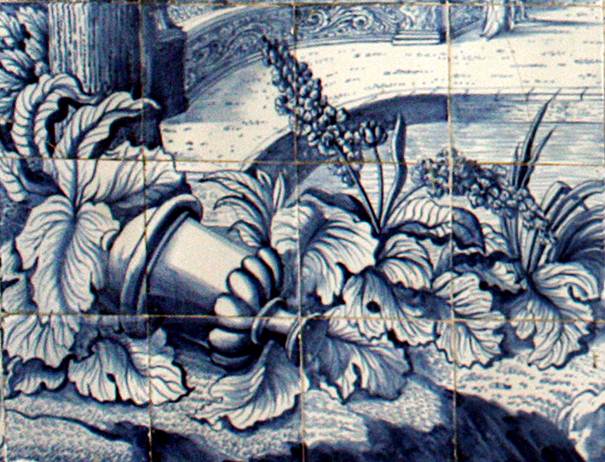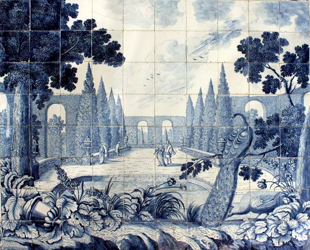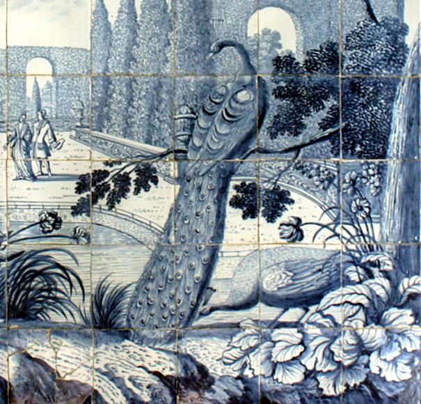 Über dem Podest im Obergeschoss findet man zwei Fliesentableaus von je 8 x 10 = 80 Fliesen, die Prospekte aus Lustgärten des Spätbarock darstellen.