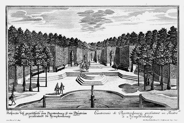 Daniel Walder nach Pierre de Bretagne, Augsburg, 1723 , Pagottenburg.... Nicht weit davon im Wald ist auch ein Ort für die Küche, daher man zum Öfteren unten im Saal speist. Die Pagen und Lakaien machen ihre Aufwartung durch die Fenster, daß man also von den Bedienten nicht inkommodiert wird. ... “