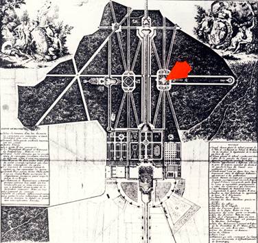 Kurfürst Max Emanuel ließ die Pagodenburg nördlich des Hauptkanals von 1716 bis 1719 durch Joseph Effner (2) erbauen. Der Pfeil weist auf die Pagodenburg hin.