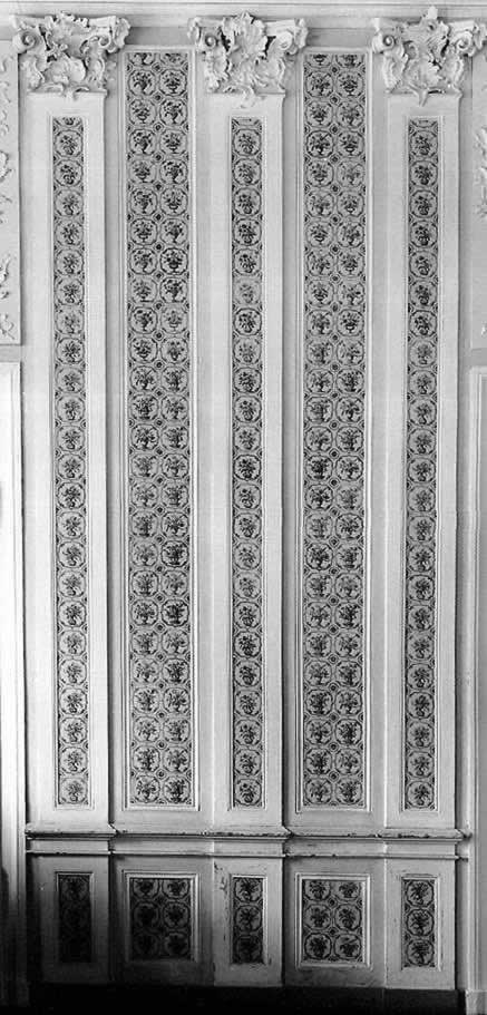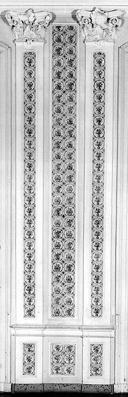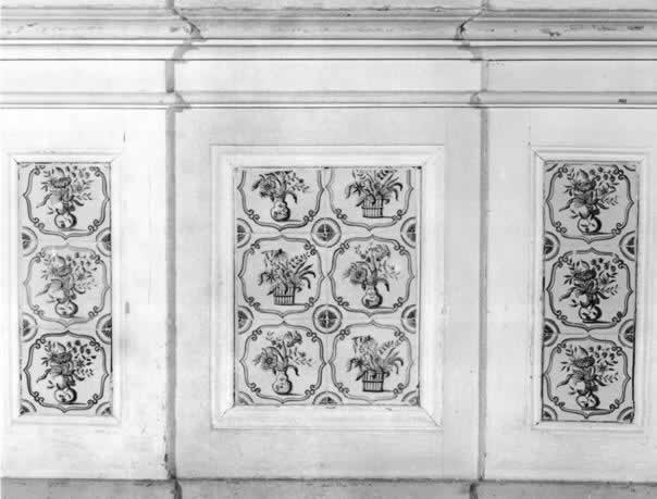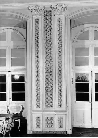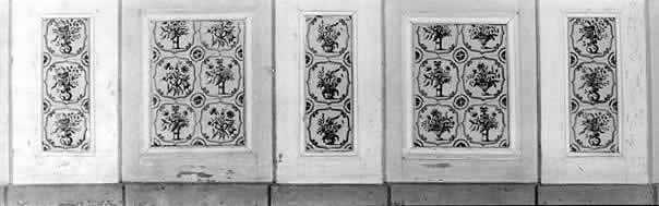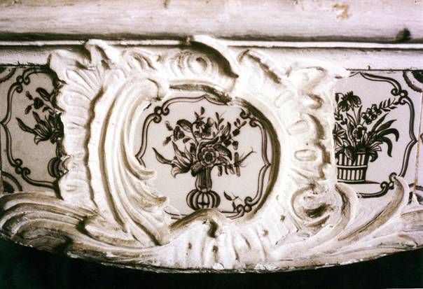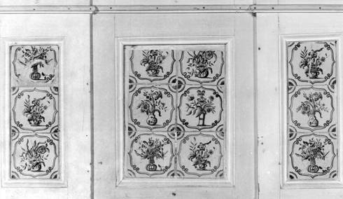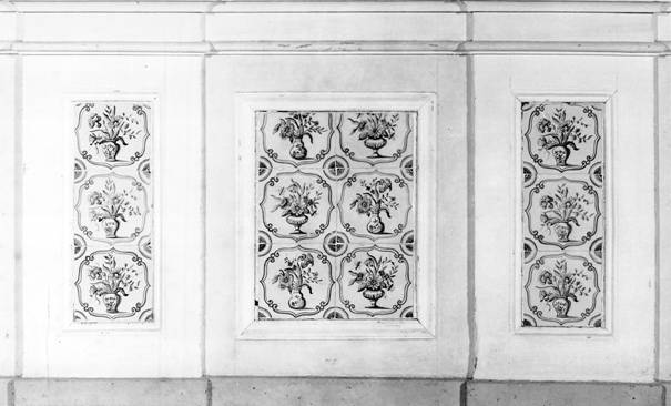 Rotterdamer Fayencefliesen wurden als Füllungen in die Pilasterschäfte und zwischen den Pilastern eingearbeitet.