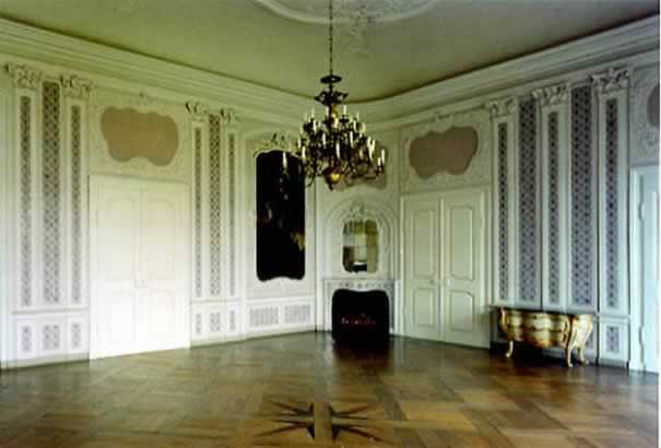 Im Erdgeschoss des Mitteltraktes liegt ein großer Saal, in der Höhe Erd- und Zwischengeschoss umfassend. Sehenswert ist dieser Saal wegen seiner reichen Stuckarbeiten, vor allem aber wegen seiner interessanten Wandgliederung aus Fayencefliesen.