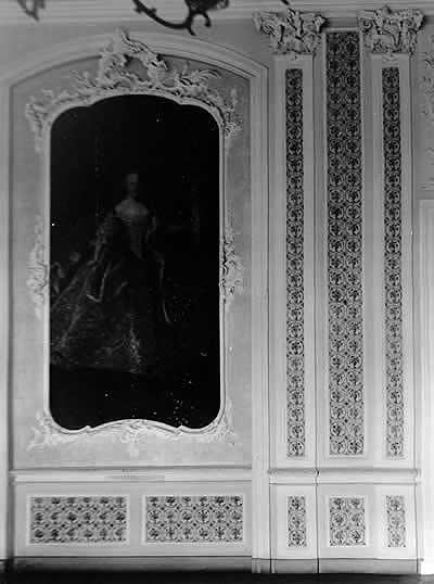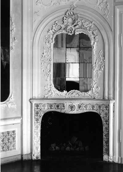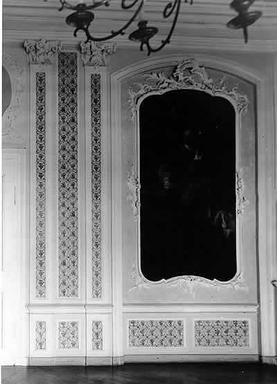 Die stuckierten profilierten Wangen und Simse sind in recht qualitätvollem Rocaillededekor ausgeführt.