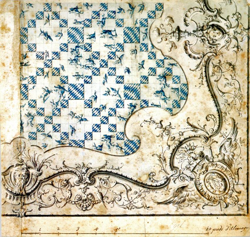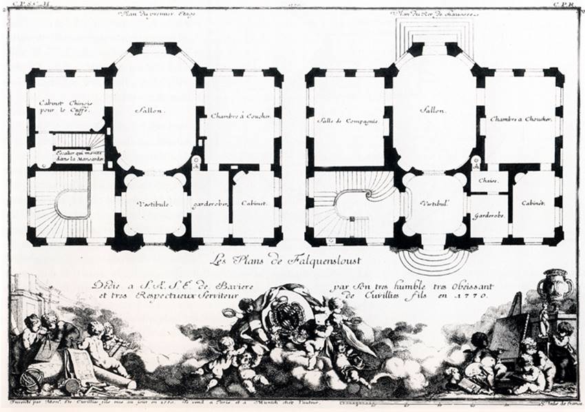 Spiegelbeeldige plattegrond van slot Falkenlust door Cuvilliés de Jongere, 1770, vermoedelijk naar een tekening van zijn vader. Stadtmuseum Bonn