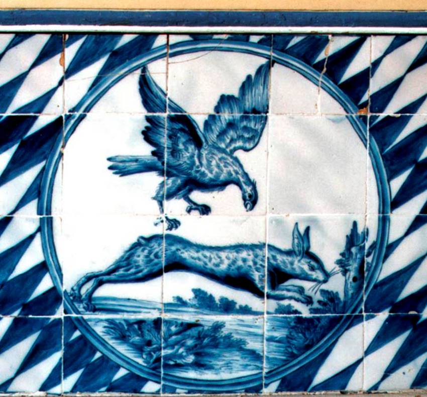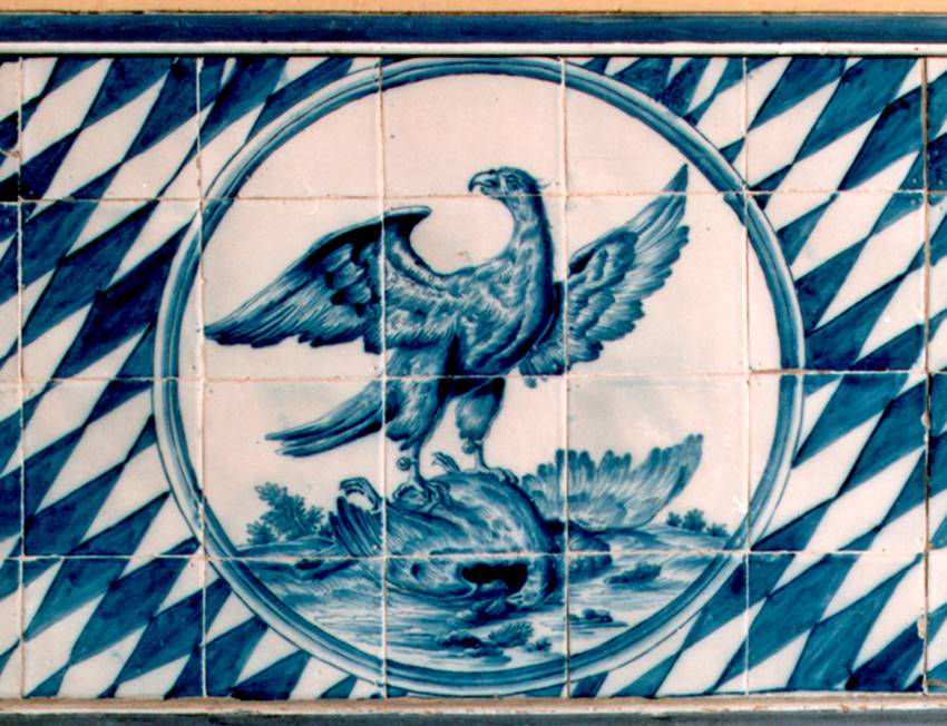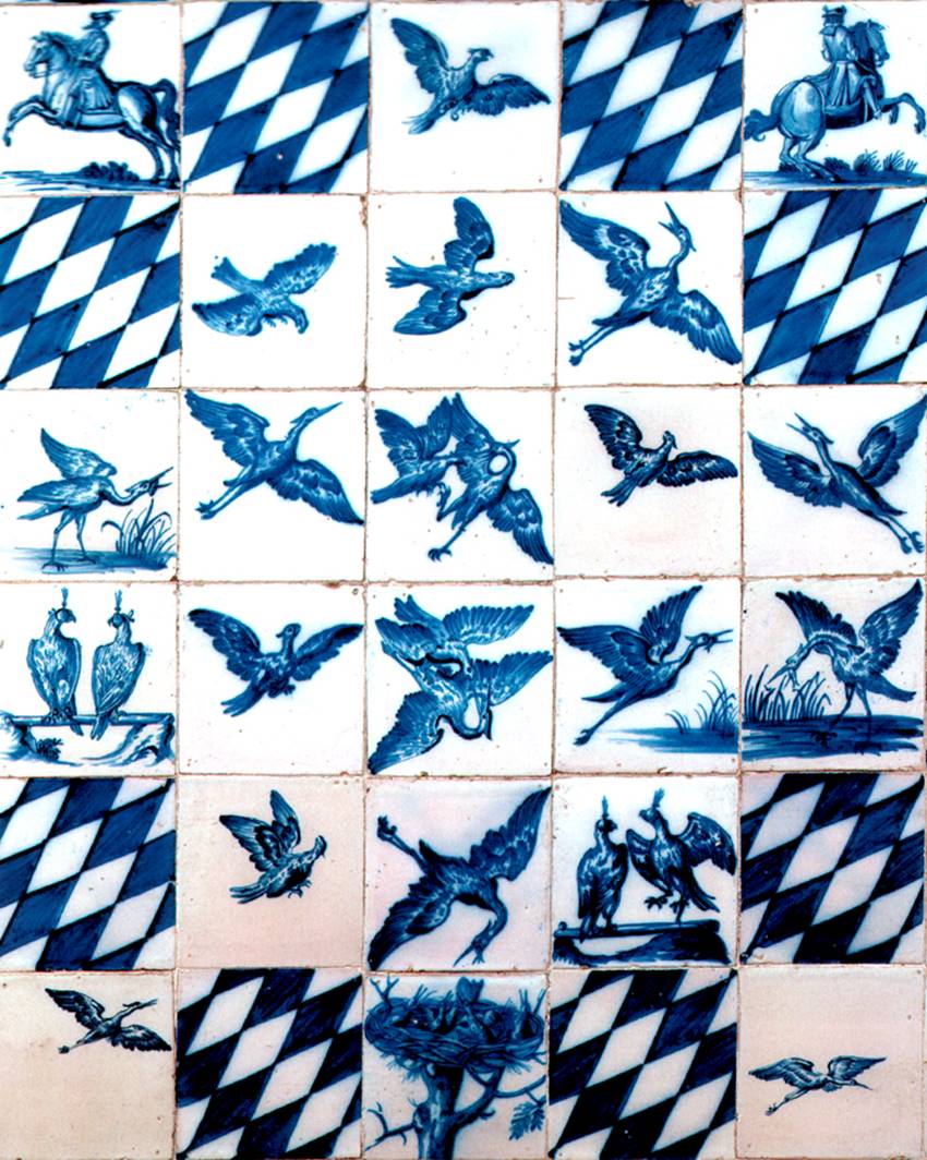 De betegeling van de lambriseringen bestaat telkens uit tegels met de smalle blauwe ruiten van het Wittelbachse wapen; in vier van daarvan is een cirkelvormig tableau opgenomen met daarin een voorstelling van een valk die een haas aanvalt, een valk die over een reiger triomfeert, een reiger die een vis vangt en een reiger die jongen in het nest voert –de laatste voorstelling is een vergroting van de tegels in het trappenhuis.