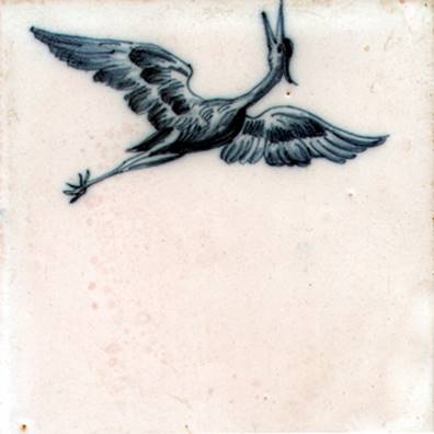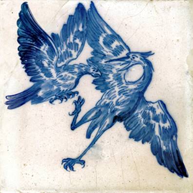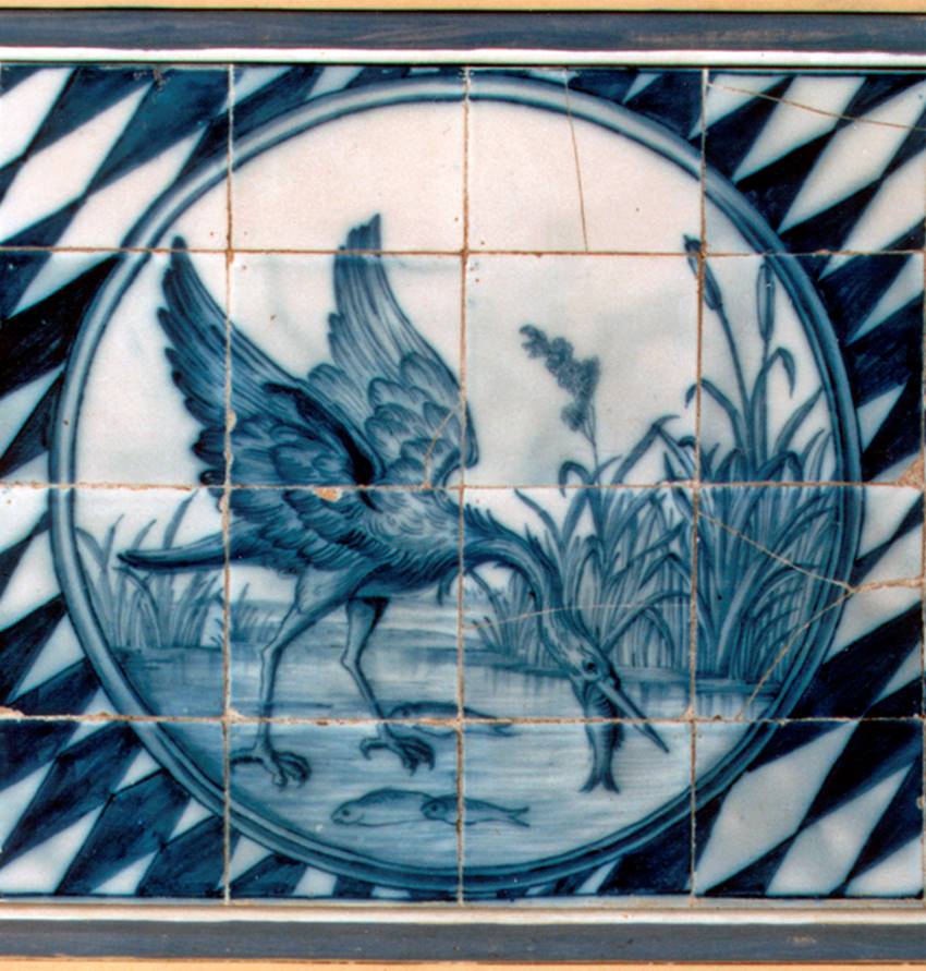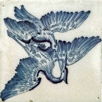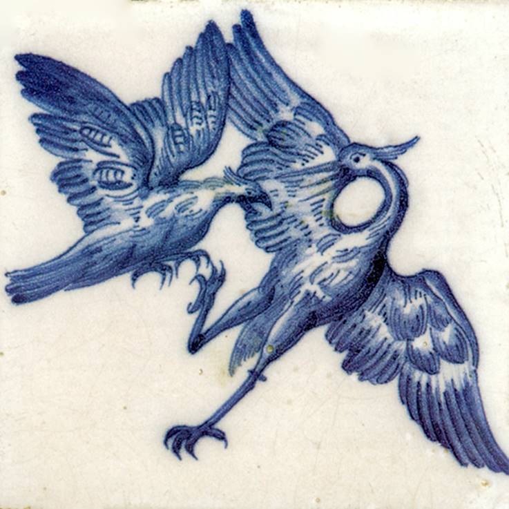 Deze groep toont de reigers en valken van dichterbij, met daarbij in het centrum twee tegels met dramatische afbeeldingen van het gevecht tussen valk en reiger en daaronder een reiger bij een nest met reigerkuikens.