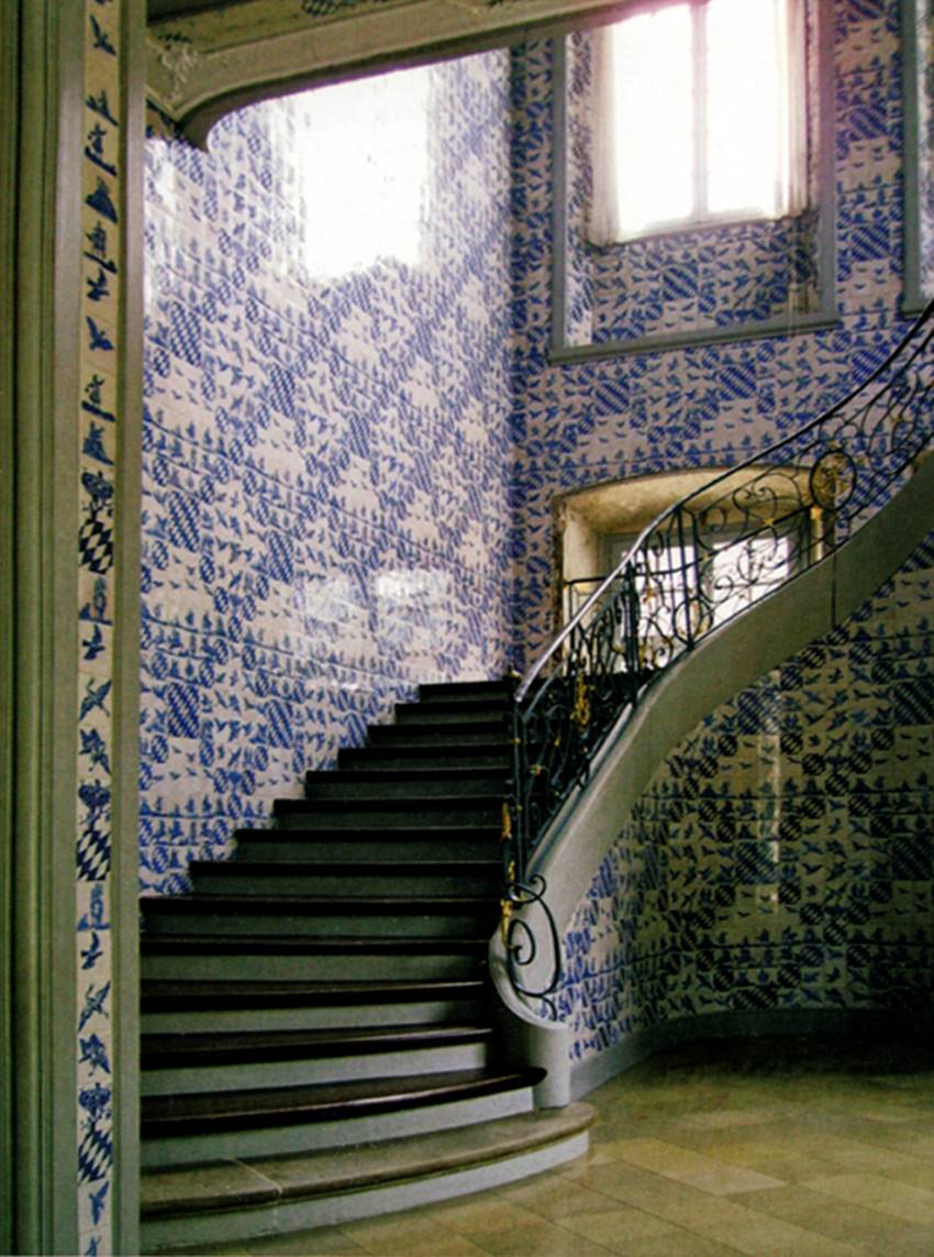 De zwierig gebogen trap met treden van eikenhout wordt door een vierkant overloopje onderbroken zodat de trap gemakkelijk begaanbaar is. De wanden zijn geheel bekleed met tegels beschilderd met verschillende afbeeldingen van de valkenjacht, omlijst door tegels met smalle ruiten die aan het familiewapen Wittelsbach zijn ontleend.