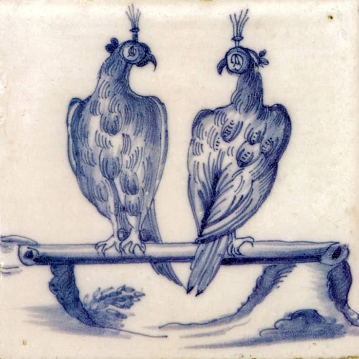 Tegel D 14, op de huifkapjes van de valken op het rek staan de initialen CA voor Clemens August