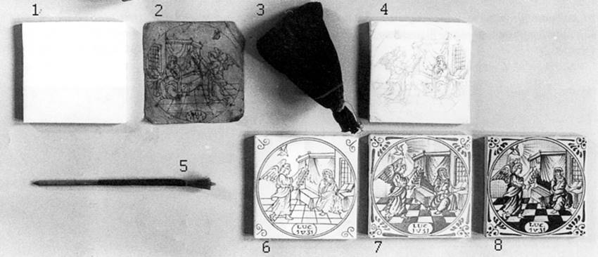 Naast de aquarellen bevinden zich in dezelfde collectie van het Rotterdamse Gemeentearchief ook twintig sponsen voor figuratieve tegels in het trappenhuis van Falkenlust (GAR 1976-3151t/m 3170). Dat maakt toeschrijving van de tegels in Falkenlust aan een Rotterdamse bakkerij onbetwijfelbaar. De blaadjes geschept papier waarin details van watermerken te onderscheiden zijn, meten ongeveer 13 x 13 cm. en tonen geen enkel spoor van een tekening. De voorstelling is geheel opgebouwd uit dicht naast elkaar gezette zeer fijne prikgaatjes. Doordat de sponsen ook daadwerkelijk zijn gebruikt, steken de gaatjes aan de keerzijde zwart, en natuurlijk spiegelbeeldig, tegen het papier af.