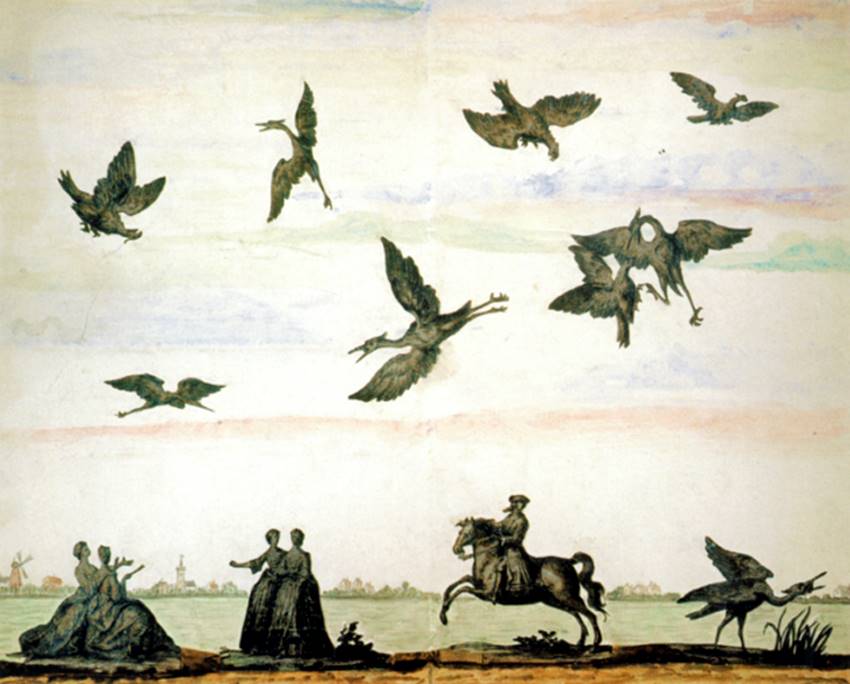 Op basis van het soort papier waarop de aquarellen zijn geschilderd, kunnen deze gedateerd worden op het eerste kwart van de negentiende eeuw. In die tijd zal de toenmalige bezitter, een tegelbakker, van de oorspronkelijke ontwerpen voor Falkenlust de voorbeelden hebben uitgesneden en opgeplakt. De opdracht van Clemens August was allang voltooid; dat er ooit nog vraag zou zijn van tegels met voorstellingen van de valkenjacht was onwaarschijnlijk en zo kregen de producten van Duits-Franse hofkunst nog een tweede leven in Hollandse landschapjes die misschien  aan de wand van de bakkerij hebben gehangen.