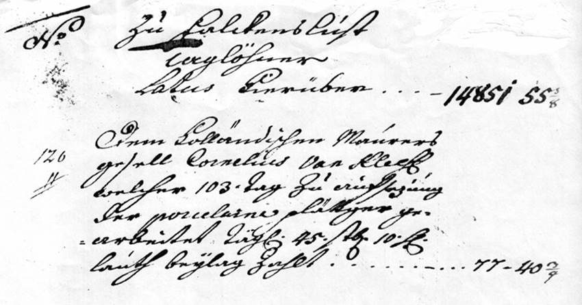 Na de vermelding in de bouwrekeningen van Falkenlust van de 26 kisten tegels in 1731 volgt in 1732 een betaling aan de ‘Holländische Mäurersgesell Cornelius van Kleeff’ die zich met de ‘aufsetzung der porcelaine plättgen’ had beziggehouden. Aan arbeidsloon ontving deze voor 103 dagen werk 77 Reichstaler 40 Stüber 12 Heller. Bovendien werd aan de Nederlandse meestermetselaar in 1732 ook een aanzienlijk bedrag aan reiskosten betaald, namelijk 40 Reichstaler 55 Stübern 8 Heller. In 1736 - dus na de officiële opening van Falkenlust - volgt dan nog een betaling voor een tweede hoeveelheid tegels aan ‘Dülmans Erben in Cöllen fracht von 5 Kisten porcelaine plättgen aus Holland’, en in 1737 worden enige dagloners betaald voor tegelzetwerk in het trappenhuis.