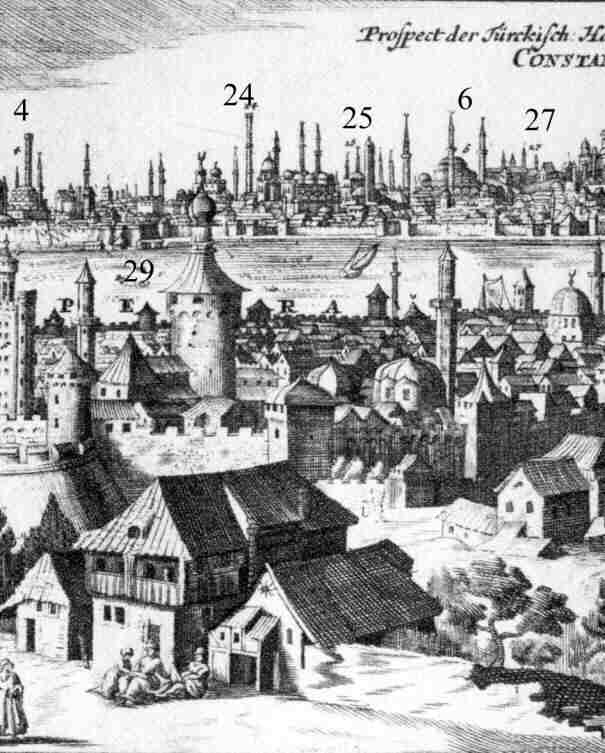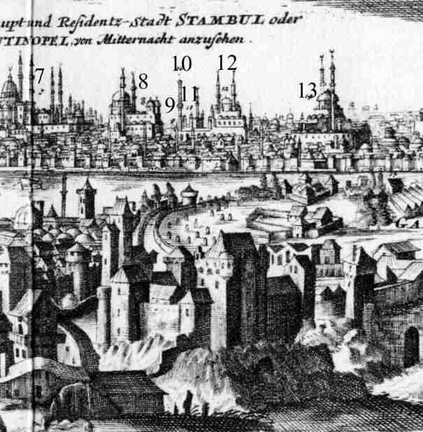 „Alt-Istanbul im Stadtteil Fatih wird vor allem von den Großmoscheen und einer ehemaligen Kirche geprägt, die auf den sieben Stadthügeln thronen. Auf dem ersten Stadthügel liegt die Hagia Sophia und knapp dahinter die Sultan-Ahmed-Moschee, auf dem zweiten die Nuruosmaniye-Moschee, auf dem dritten die Süleymaniye-Moschee, auf dem vierten die Fatih-Moschee Sultan Mehmeds II., auf dem fünften die Sultan-Selim-Moschee, auf dem sechsten die Mihrimah-Moschee und auf dem siebten, nicht vom Goldenen Horn einsehbaren Stadthügel die Haseki-Hürrem-Sultan-Moschee.“ (Ausschnitt aus wikipedia./org/wiki/Konstantinopel