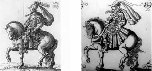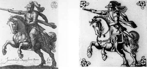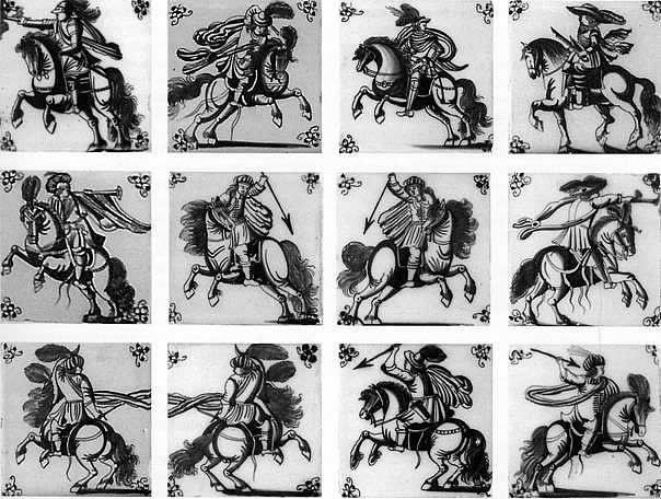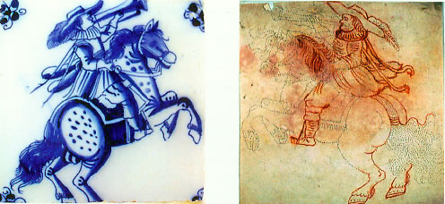 Het gaat hier om een opvallende serie ruitertegels, waarvan sponsen bewaard zijn in het Rotterdams gemeentearchief. Ze zijn deels geschilderd naar prenten van Antonio Tempesta (1555-1630). Dit type fijn geschilderde tegels met grote ruiter is aangetroffen in kastelen en paleizen op diverse plaatsen in Europa, maar nauwelijks in Nederland (afb. 4). Blijkbaar sprak het onderwerp de internationale adel aan. Deze tegels (soms slechts fragmenten) zijn onder meer gevonden in het Petit Trianon in Versailles, in de kastelen van Labbeville en Rochechouart, in het Tredegar House in Wales, en in het 'Casa do Paço' in Figueira da Foz in Portugal. Er kan dus gesteld worden dat deze Rotterdamse ruitertegel een gewaardeerd exportproduct was. (9)HORSEMAN TILES IN SCHWETZINGEN MADE IN ROTTERDAM