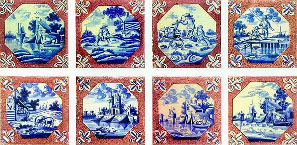Afb. 13 Landschappen in achtkant op gesprenkeld fond met uitgespaarde lelie