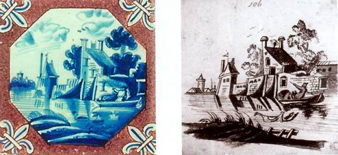 Afb. 14 Tegel in Schwetzingen Afb. 15 Voorbeeldboek voor tegelschilders (Gemeentearchief Rotterdam GAR 3195-45)
