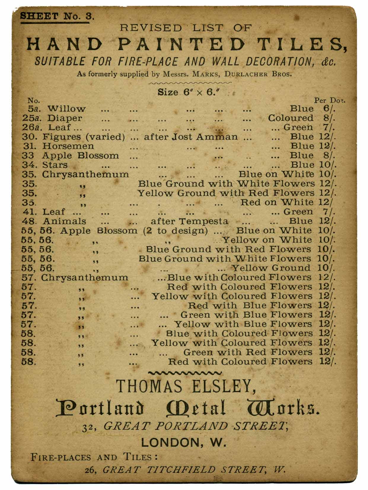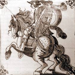 These particular designs with figures on horseback continued to be used by Dutch tile makers until the end of the nineteenth Century. An example with the Roman noblewoman Cornelia on horseback appears in the Thomas Elsley catalogue (London) of circa 1890 as part of a range of tiles imported from Holland.