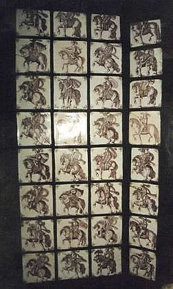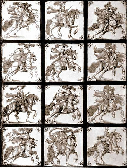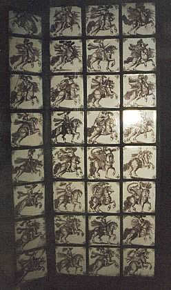 Tiles with figures on horseback from Rotterdam and Utrecht in Tredegar House, Wales