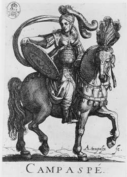 Early sixteenth century Italian copperplate engraving signed A.tempesta fe. (Antonio Tempesta, fecit) with a representation of Campaspé on horseback, which served as an example for the Dutch tile illustrated (Courtesy Kupferstichkabinett, Dresden, Germany)