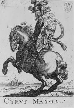 Early sixteenth century Italian copperplate engraving signed A.tempesta fe. (Antonio Tempesta, fecit) with a representation of Cyrus Mayor on horseback, which served as an example for the Dutch tile illustrated (Courtesy Kupferstichkabinett, Dresden, Germany)