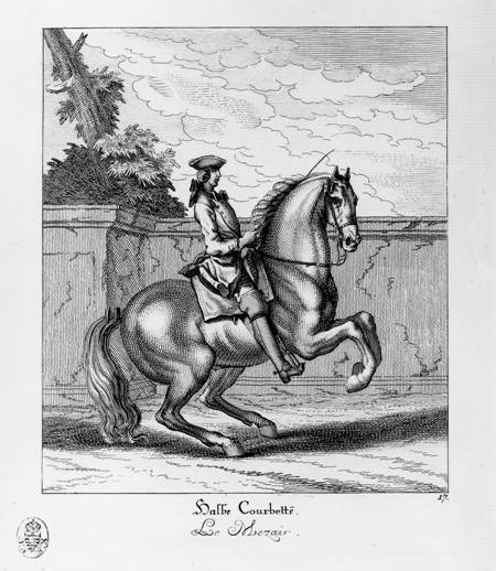 Eighteenth Century German copperplate engraving by J.E. Ridinger based on a painting by E.M. Steinberger from a series of prints showing scenes of horses being exercised in a riding school. This print served as an example for the Dutch tile illustrated in fig. 9 (Courtesy Kupferstichkabinett, Dresden, Germany)