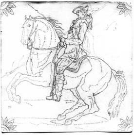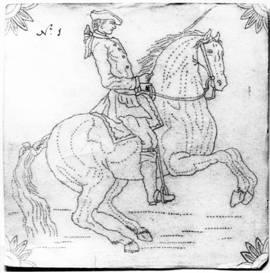 Late nineteenth century pinpricked designs from the Ravesteijn tilefactory in Utrecht, based on the copperplate engraving by J.E. Ridinger illustrated in fig. 9 through the pinholes, which would leave a faint impression of the picture on the unfired white tin glaze as guide for the painter.
