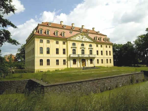 The moated castle of Wachau was built on oak piles on the site of two earlier structures. The construction of the Baroque plan between 1730 and 1754 was probably directed by the court architect Knöffel. The client was Magdalena Sophie von Schönfeldt who gave her son a gift of the castle and park. Gotthelf Kühne bought the estate in 1885 and was the first non-aristocratic owner. The property was confiscated in 1945, and taken over by the local authority. After numerous changes of use e.g. school, day nursery, Kindergarten, registry office, entertainment centre for the local authority and home to 11 refugee families, Dr. Rainar Götz from Dresden became the owner of the castle in 2002.