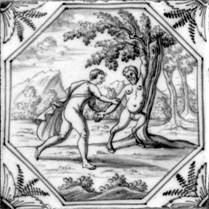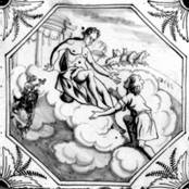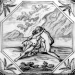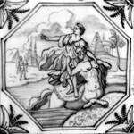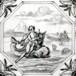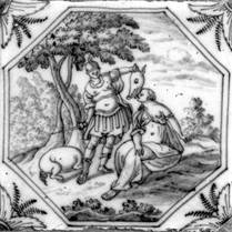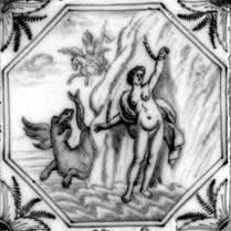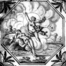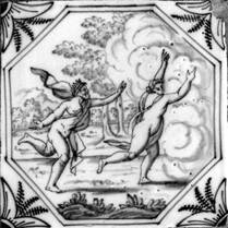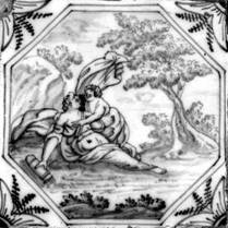 Alle Fliesen mit mythologischen Darstellungen dieses Fliesenfeldes sind in blauer Farbe im "achtkant" und mit dem Eckmotiv "geveerde hoek" gemalt.