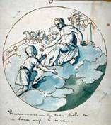 Die Vorlagen tragen unter den Darstellungen jeweils einen handschriftlichen Hinweis auf die mythologische Szene.